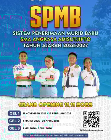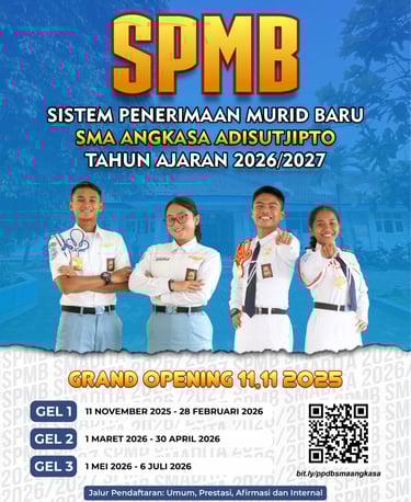 SMA Angkasa Adisutjipto dengan bangga mengumumkan dibukanya Penerimaan Peserta Didik Baru (PPDB) Gelombang 2 untuk tahun ajaran 2025/2026. Pendaftaran dibuka bagi calon siswa yang ingin bergabung dan menimba ilmu di lingkungan sekolah yang unggul dalam akademik, seni, dan karakter. Dengan fasilitas lengkap serta didukung tenaga pengajar profesional, SMA Angkasa Adisutjipto siap membentuk generasi muda berprestasi seperti para alumni sebelumnya, yang telah berhasil diterima di berbagai perguruan tinggi ternama melalui jalur SNBP dan SNBT. Jangan lewatkan kesempatan emas ini! Segera daftarkan diri Anda dan jadilah bagian dari keluarga besar SMA Angkasa Adisutjipto. Informasi lebih lanjut dapat diakses melalui website resmi sekolah atau langsung menghubungi panitia PPDB. Bersama kita wujudkan masa depan gemilang!